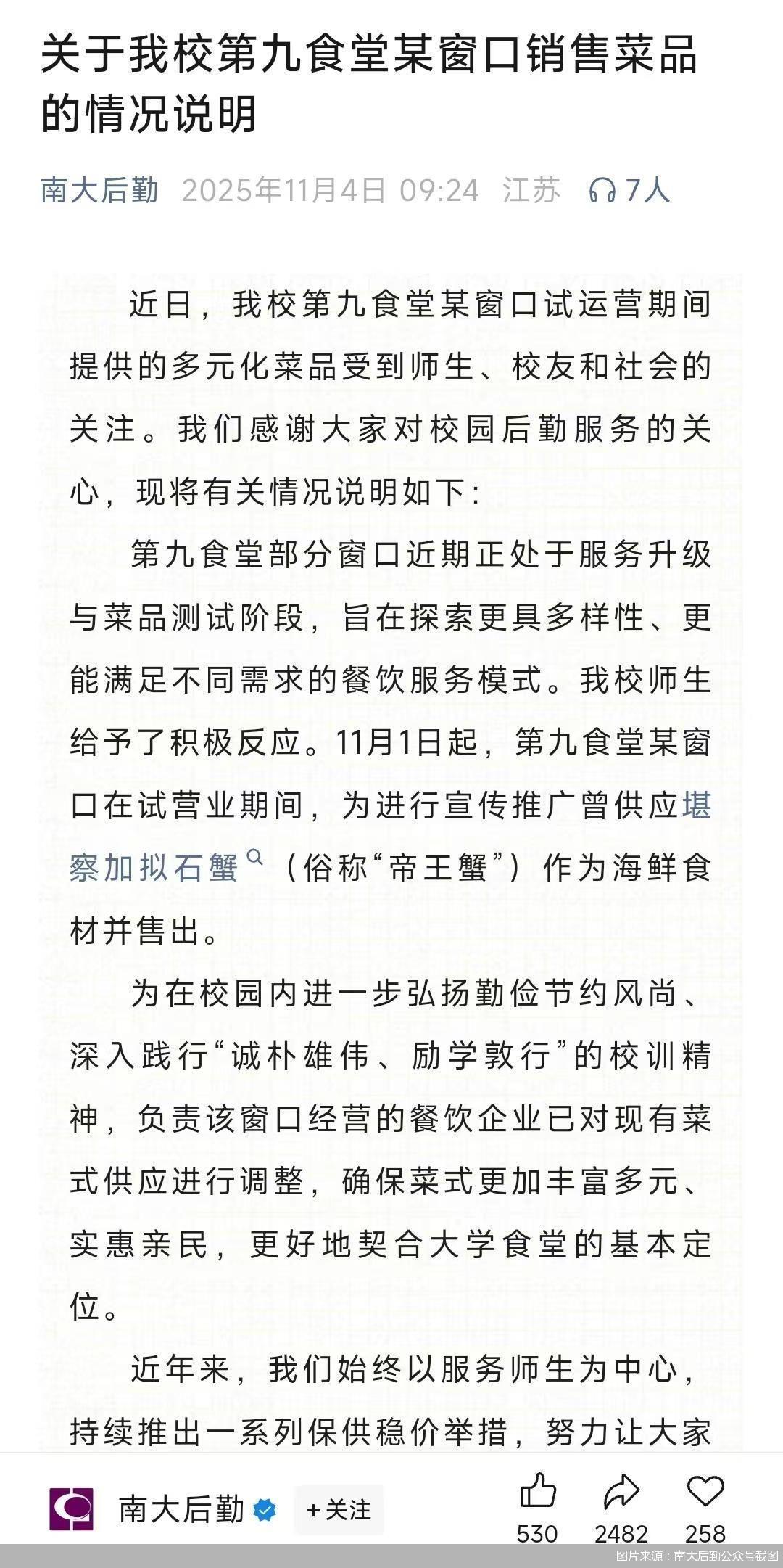 南京大学食堂停售999元帝王蟹,真不能怪网友多管闲事